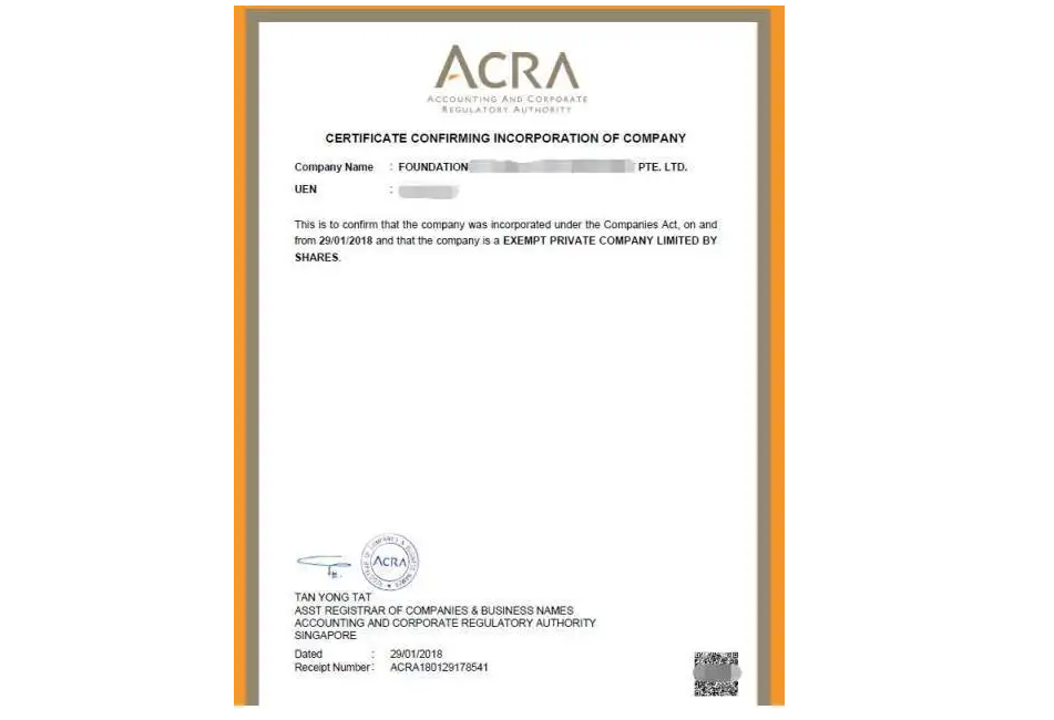 4.向新加坡會(huì)計(jì)及商業(yè)登記局提交擬注冊(cè)公司的公司章程,并繳納規(guī)定金額的注冊(cè)費(fèi)。新加坡會(huì)計(jì)及商業(yè)登記局會(huì)對(duì)文件進(jìn)行審核,如果沒(méi)有問(wèn)題,一般會(huì)在第二個(gè)工作日簽發(fā)電子版公司登記證。