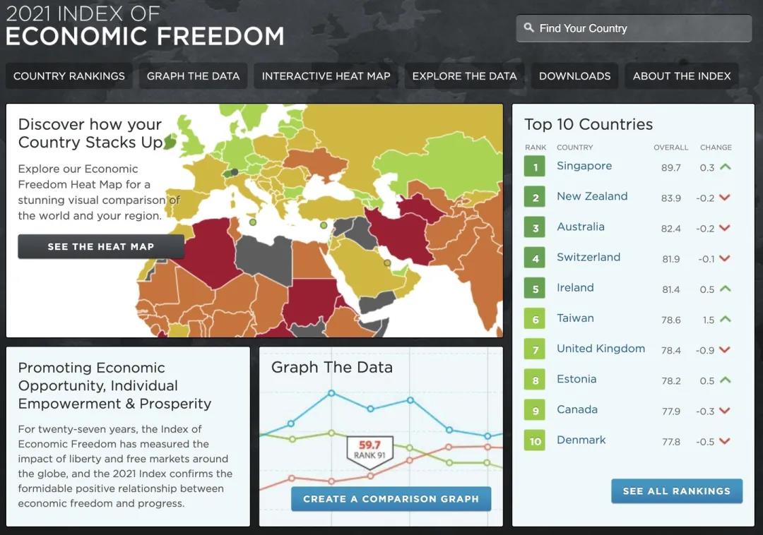在今年全球權(quán)威的經(jīng)濟(jì)自由度評(píng)價(jià)指數(shù)中,《華爾街日?qǐng)?bào)》和美國(guó)傳統(tǒng)基金會(huì)發(fā)布的2021年年度報(bào)告中,新加坡成為全球最自由的經(jīng)濟(jì)體。加拿大弗雷澤研究所最新公布的《世界經(jīng)濟(jì)自由度2020年度報(bào)告》中,新加坡排名第二。